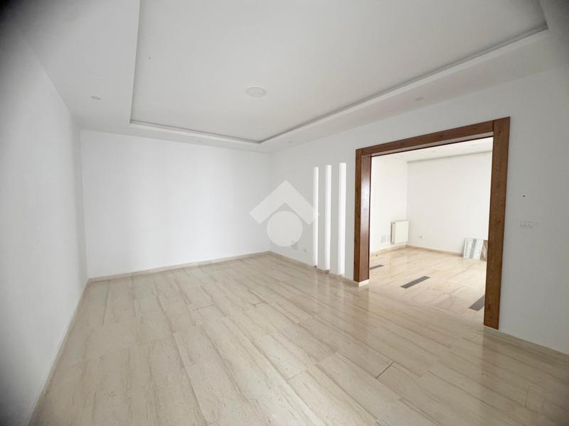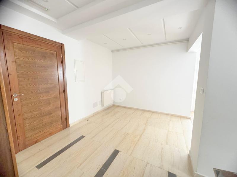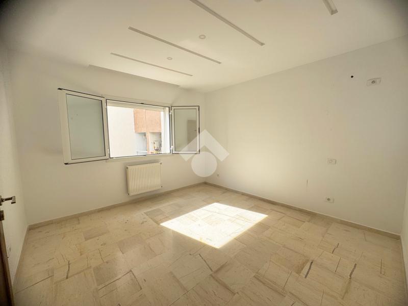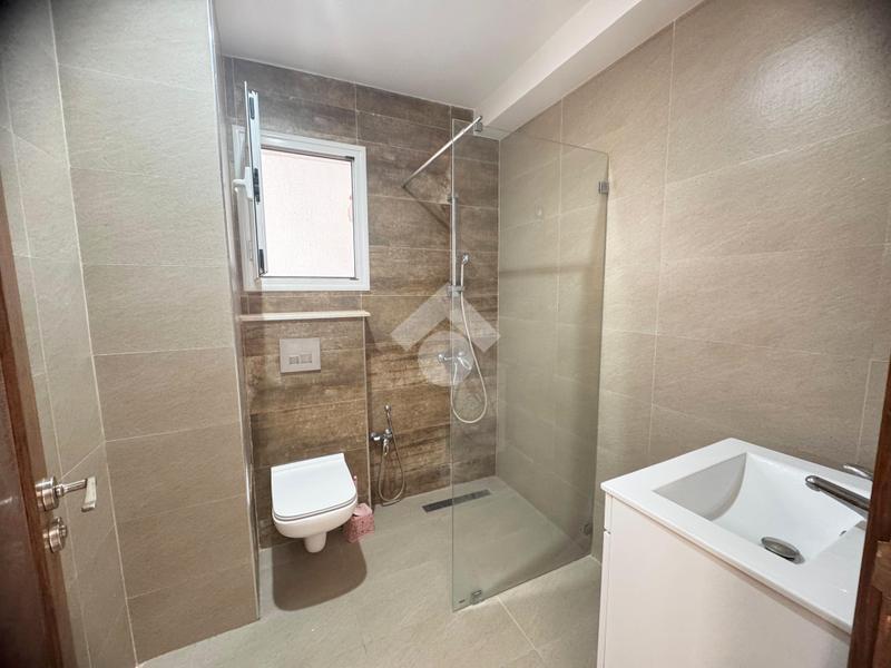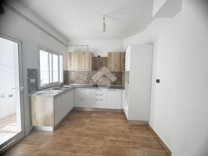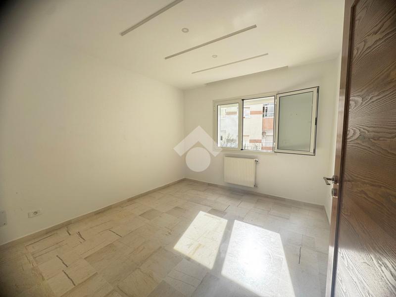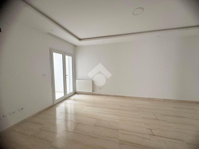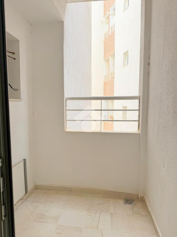 C’est un appartement S+2 vide, de haut standing, situé au premier étage. L’entrée donne sur un salon lumineux, ouvert sur un balcon. La cuisine, ouverte et entièrement équipée avec hotte et plaque, donne également accès à un séchoir. La partie nuit comprend deux chambres à coucher partageant une salle de douche commune.