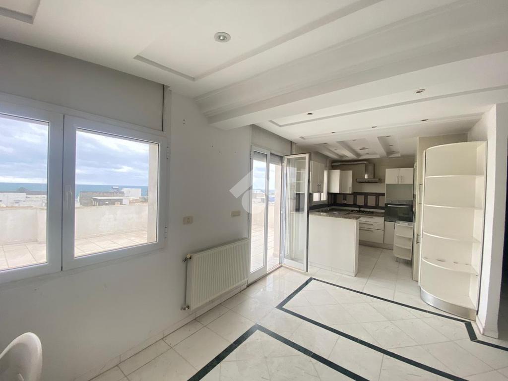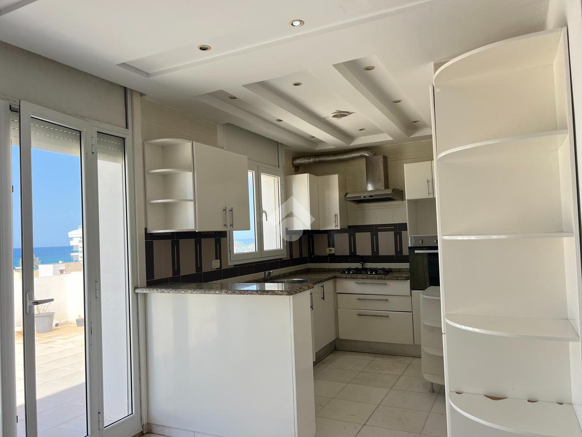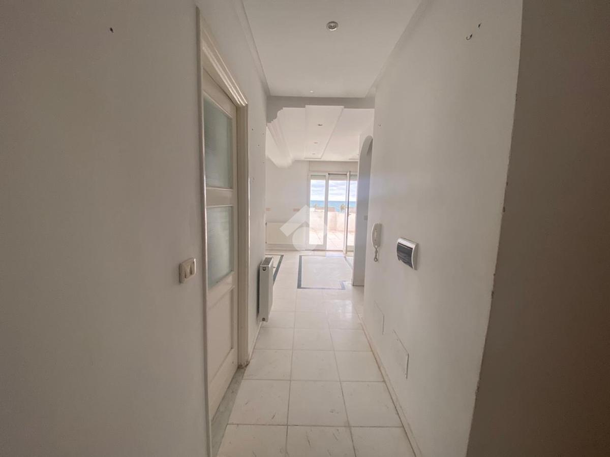 L’entrée s’ouvre sur un salon spacieux et lumineux, avec un accès direct à un balcon offrant une vue sur la mer, idéal pour profiter d’un espace extérieur agréable.